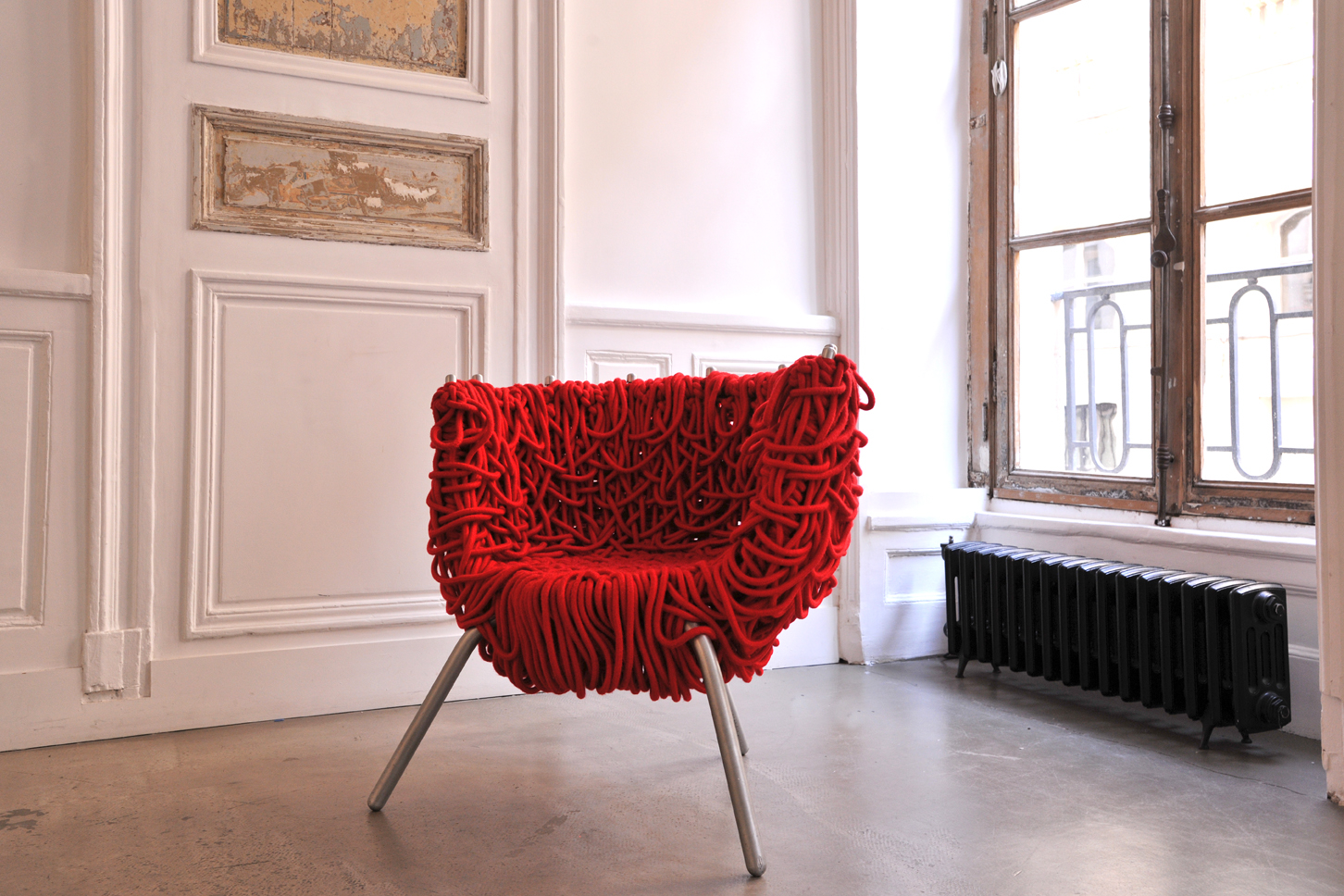 Corallo armchair, whose structure is made of hand-bent stainless steel wire, the