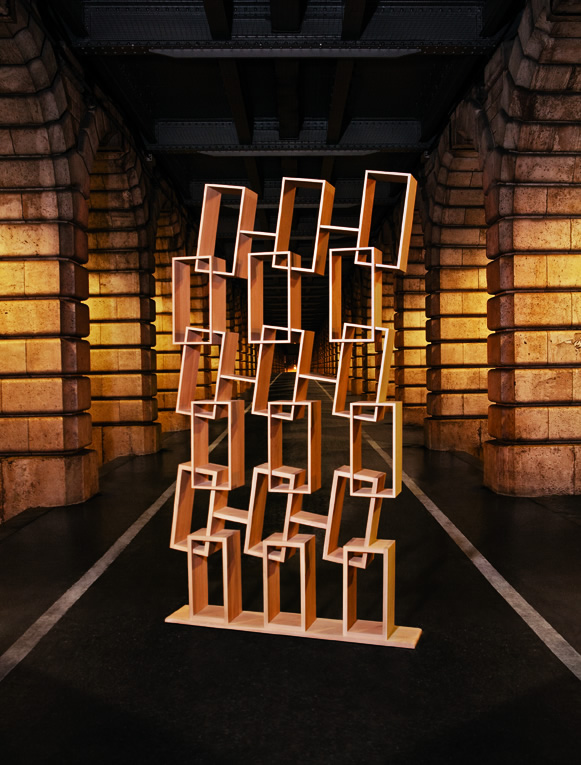 Composed of several solid oak elements assembled asymmetrically, the Kao shelving creates an illusion of instability. 18 large boxes, nested vertically in each other, can be interpreted as a bookcase or a screen wall to separate spaces.